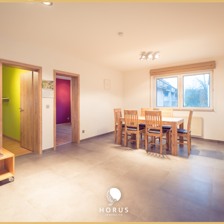 HORUS Immobilier, vous propose à la vente en exclusivité cet appartement de 2 chambres faisant +/-63m², situé au 1er étage d’une résidence de 20 unités de 1996 à Rollingen, commune de Mersch.