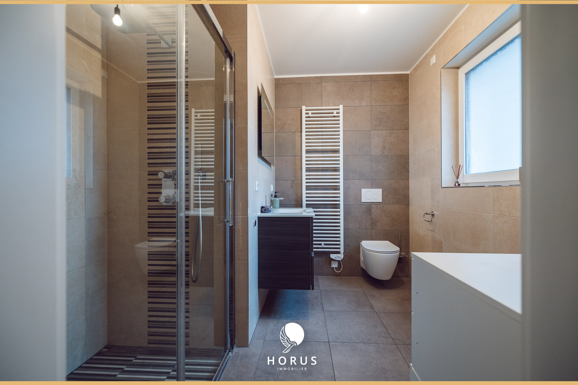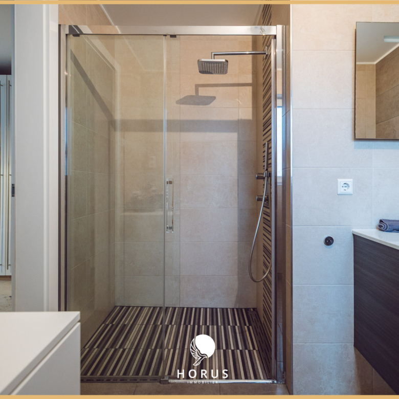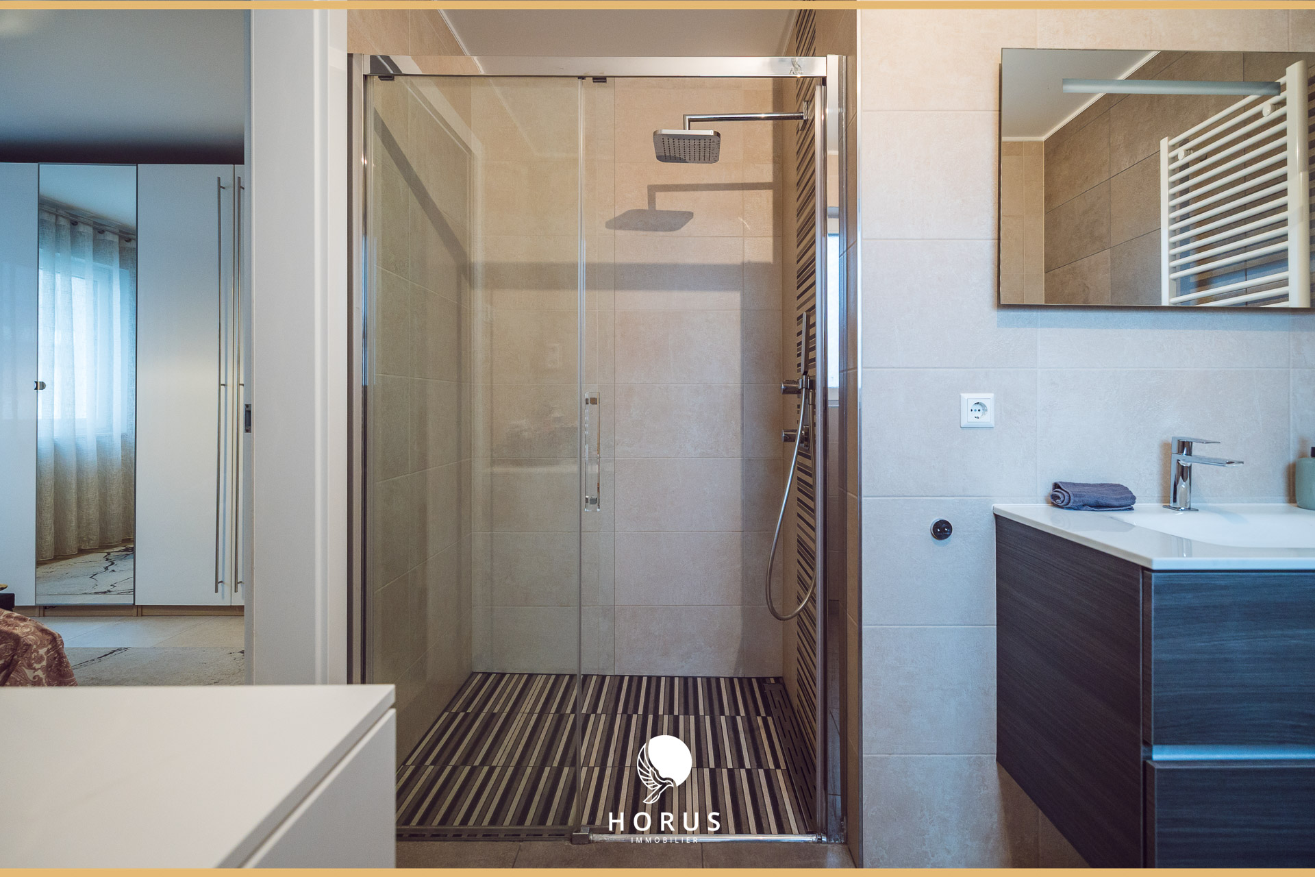 – Trois chambres à coucher (+/-13m², +/-15m² et +/-15m²) dont une avec salle de douche et WC