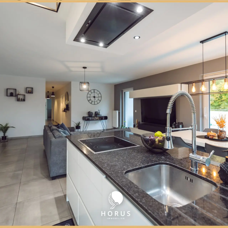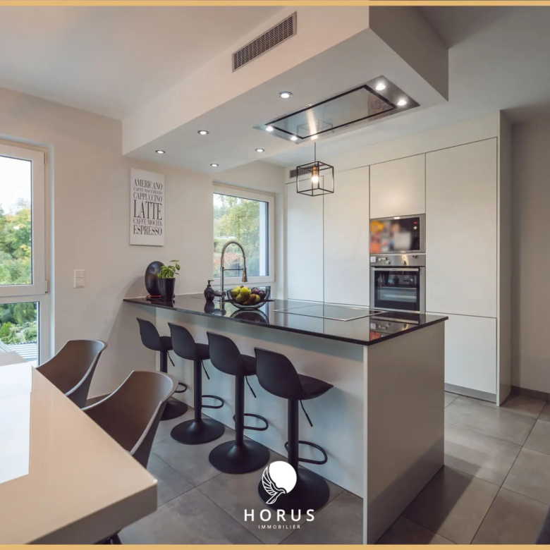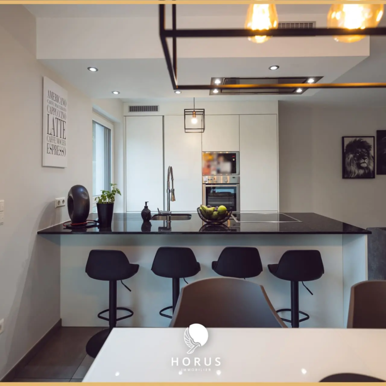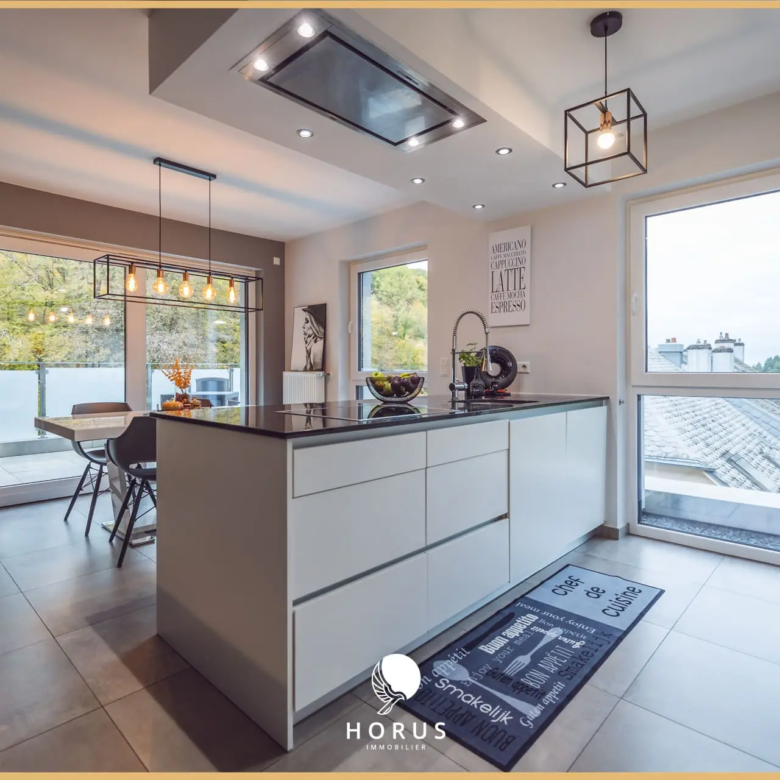 – Une cuisine équipée ouverte sur le salon / salle à manger (+/-40m²) avec accès à la première terrasse